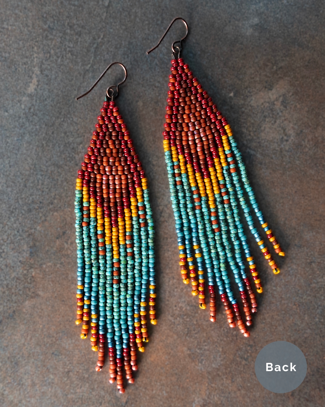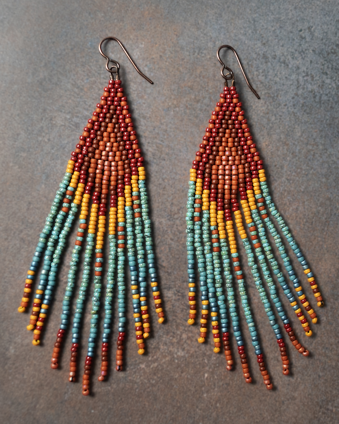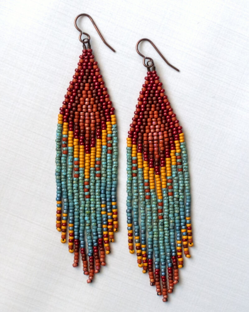 Handwoven beaded fringe earrings in a warm desert palette of reds, oranges, and turquoise. Built bead by bead with 1,200 glass beads, these earrings are lightweight, fluid, and full of movement.