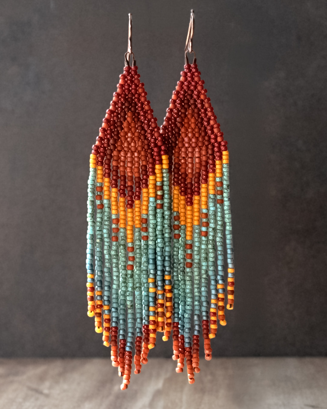 These beaded fringe earrings are all about color and movement. A brick-stitched top flows into long, soft fringe that shifts with every step. The palette blends jujube red, layered oranges, and turquoise blues — warm tones balanced with cooler accents. The colors transition naturally from rich reds at the top into sunlit oranges and cooler turquoise tones through the fringe, creating a sense of depth and motion throughout the design.