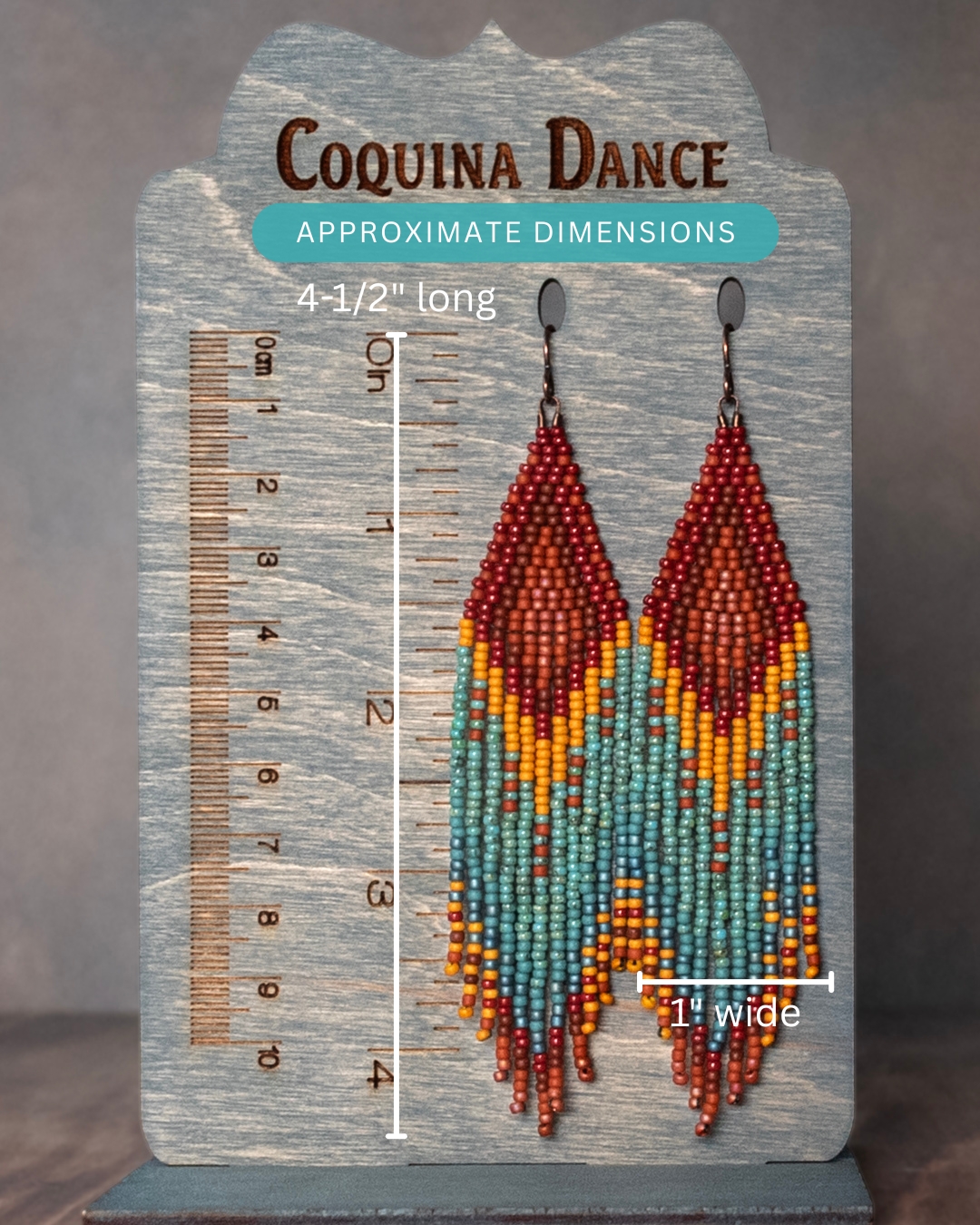 Each pair is handwoven bead by bead using a combination of brick stitch and individually strung fringe, with 1,200 glass seed beads per pair.