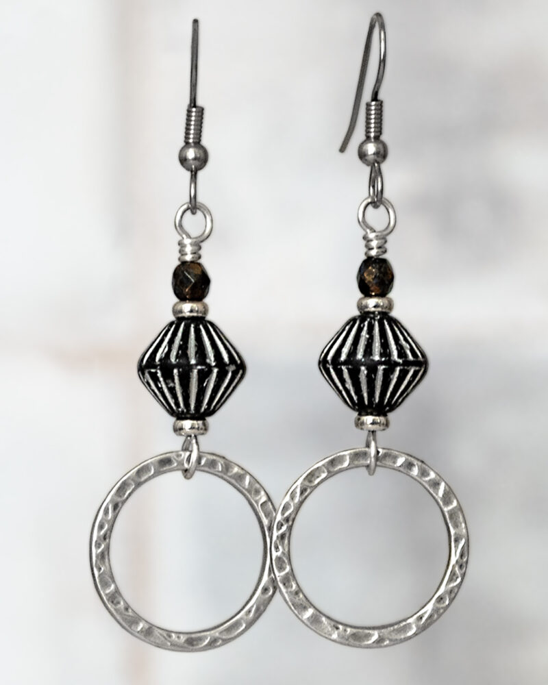 Reach for these Black Czech Glass Dangle Earrings when you want a little edge without going over the top. Sleek, understated, and quietly bold, they blend dark Czech glass with textured silver details to create a look that feels modern, artistic, and effortless.
