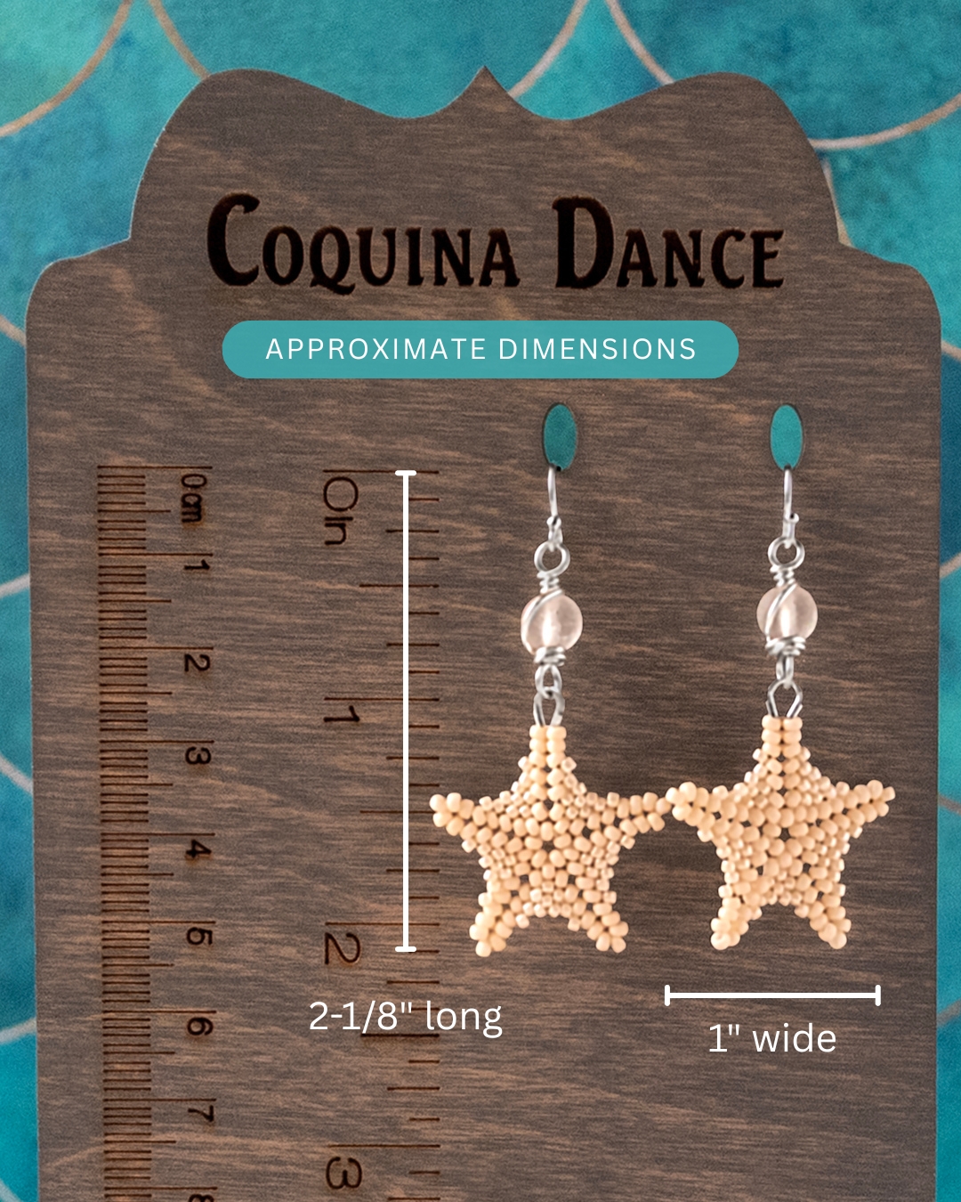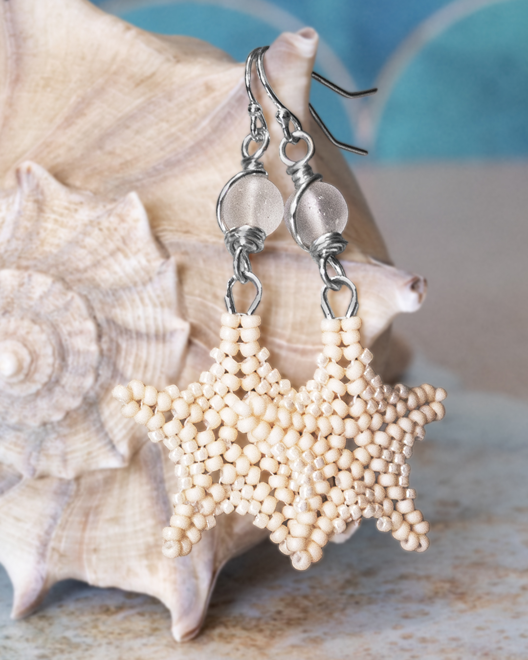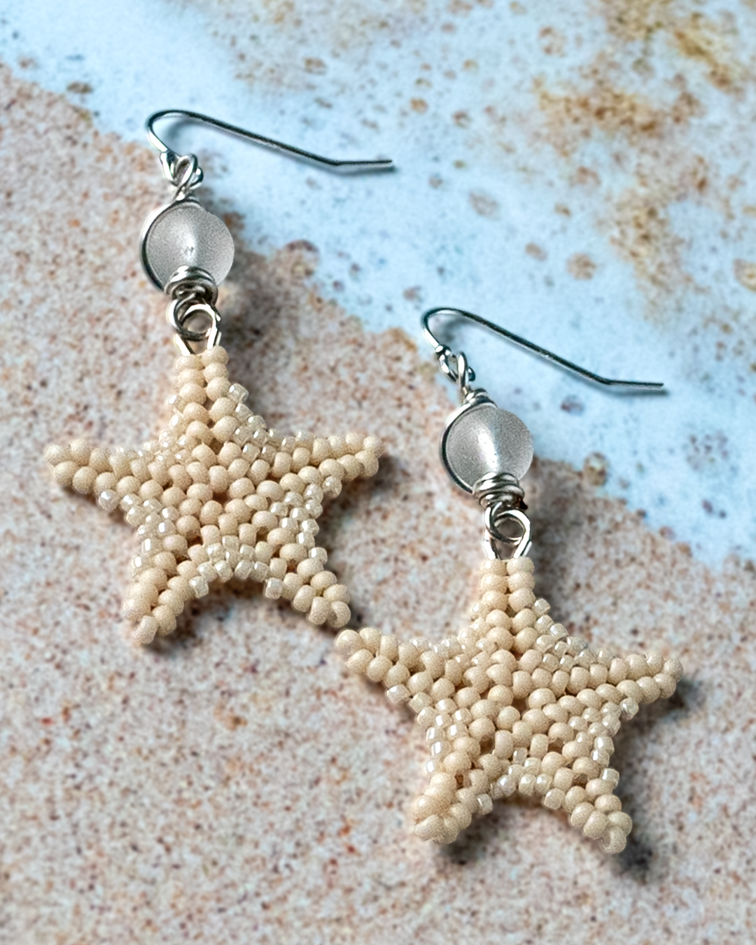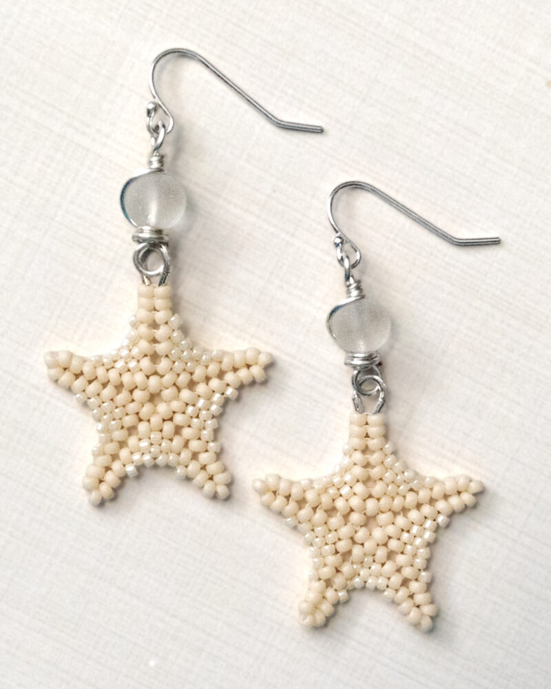 Each starfish is handstitched bead by bead using 270 individual seed beads per pair and durable FireLine thread. The starfish dangles from a wire-wrapped cultured sea glass bead. Every pair is made one at a time in my Port Aransas studio.