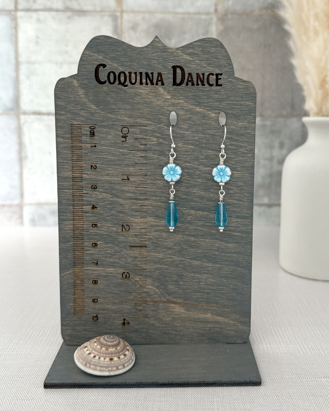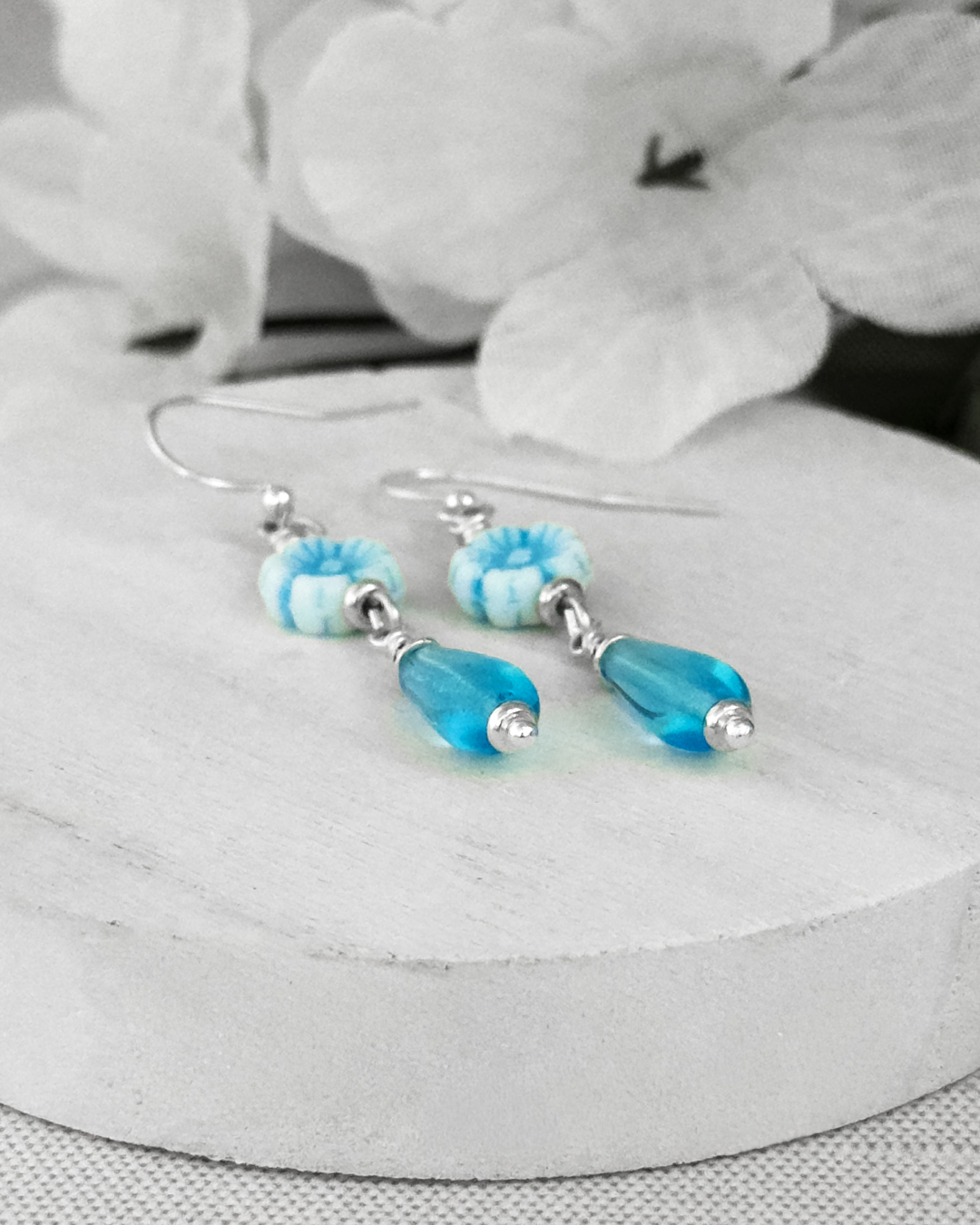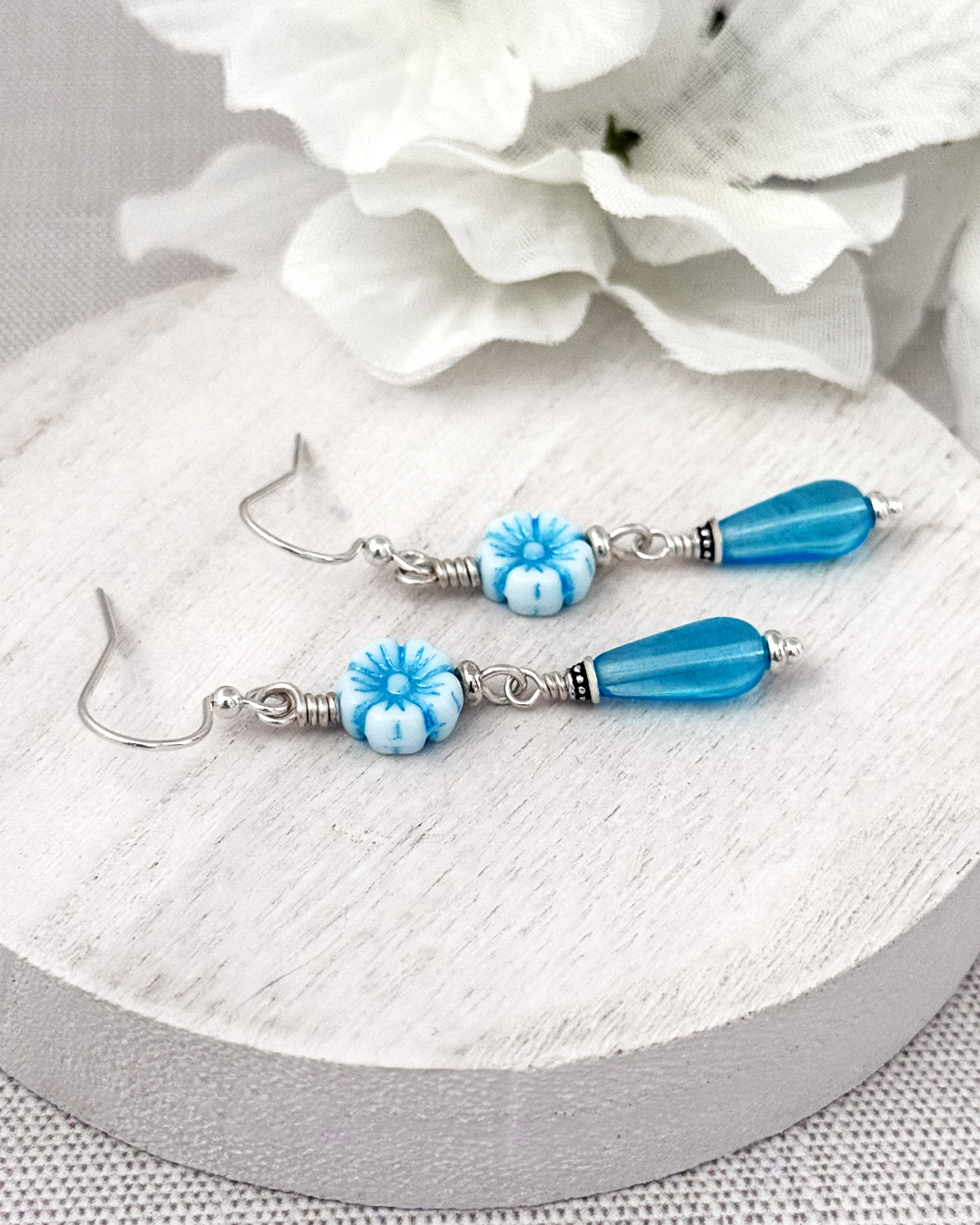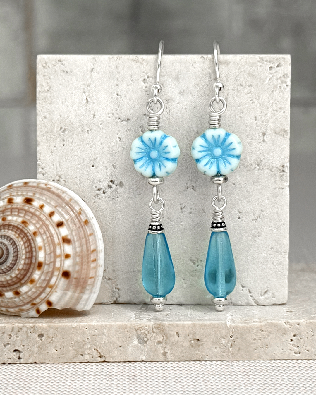 Blue and airy with a soft coastal feel, these Czech glass floral dangle earrings feature delicate baby-blue hibiscus flower beads paired with aqua teardrop glass drops. They’re lightweight, soothing to look at, and easy to wear — kind of like carrying a tiny piece of sea-glass sky with you.