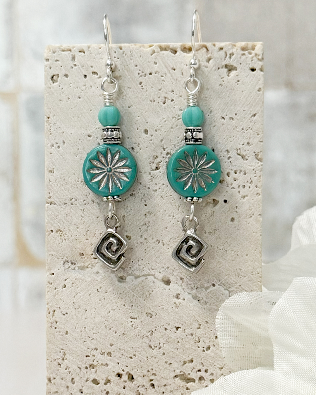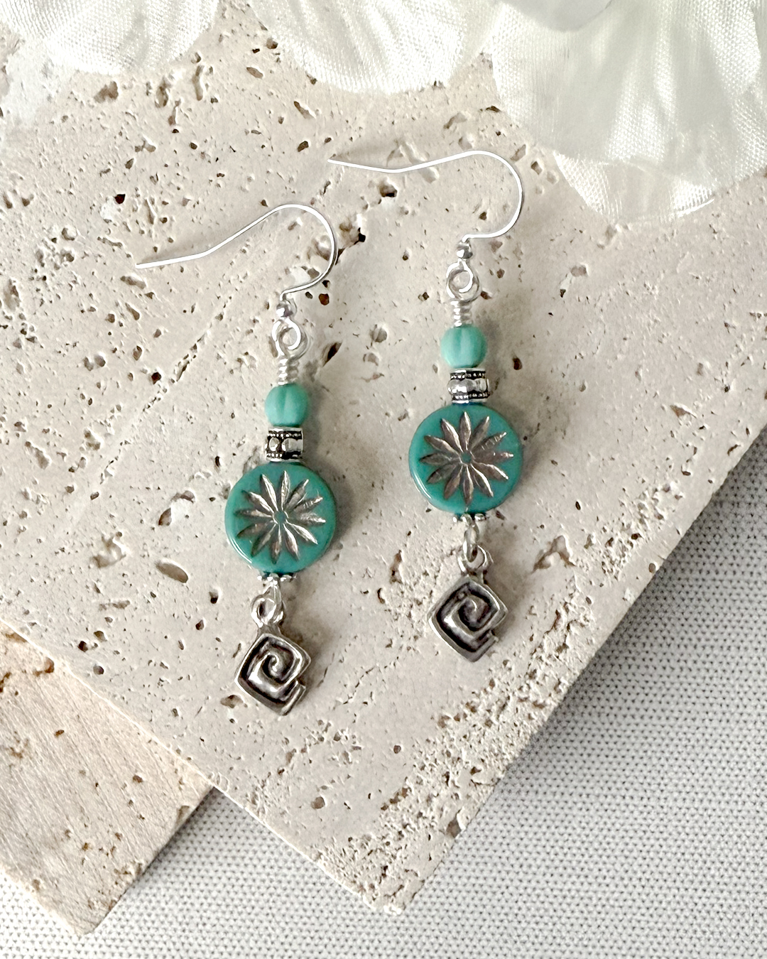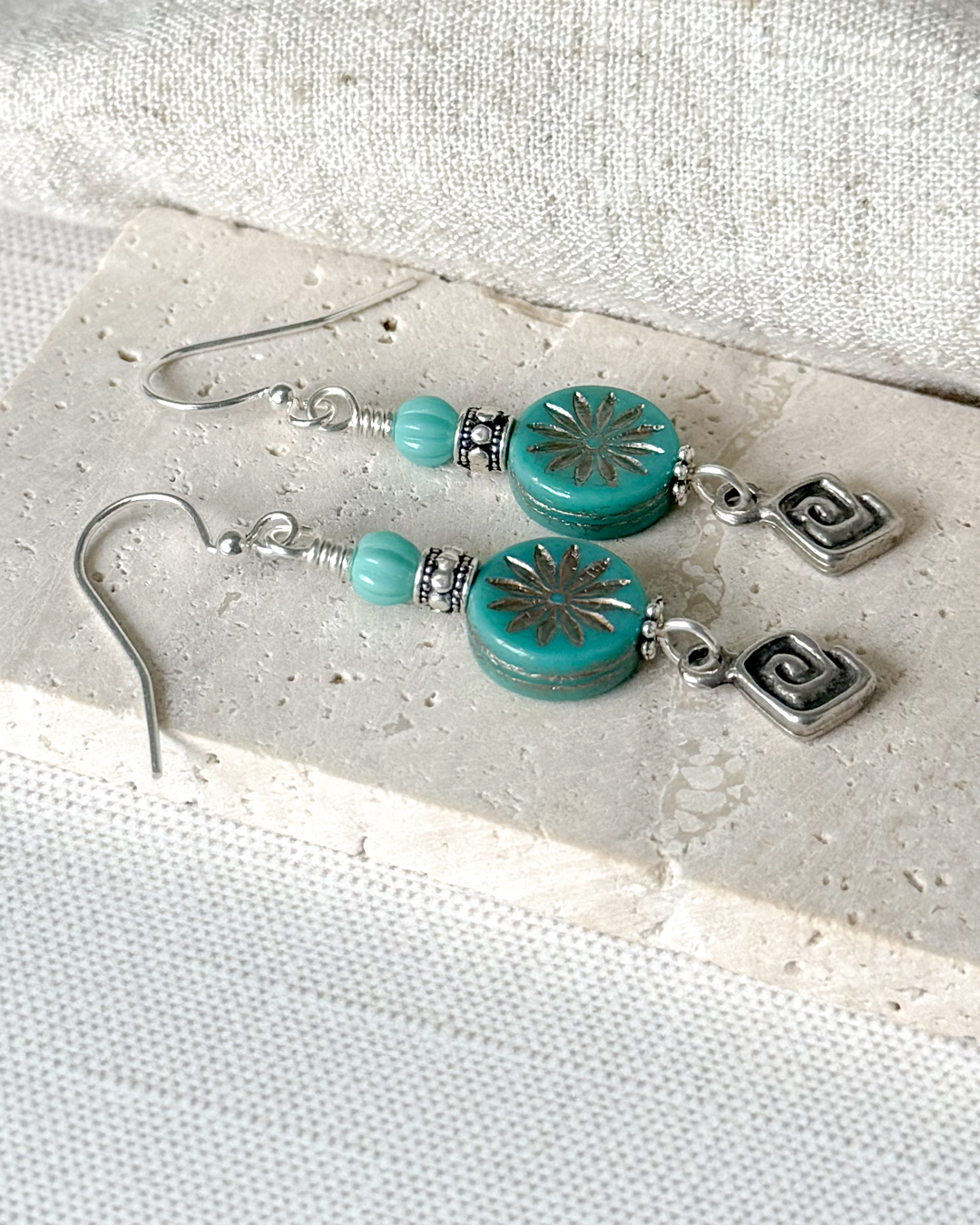 These handcrafted Turquoise Aster Czech Glass Coin Earrings feature platinum-washed aster flower coins, melon beads, and Greek Meandros charms.