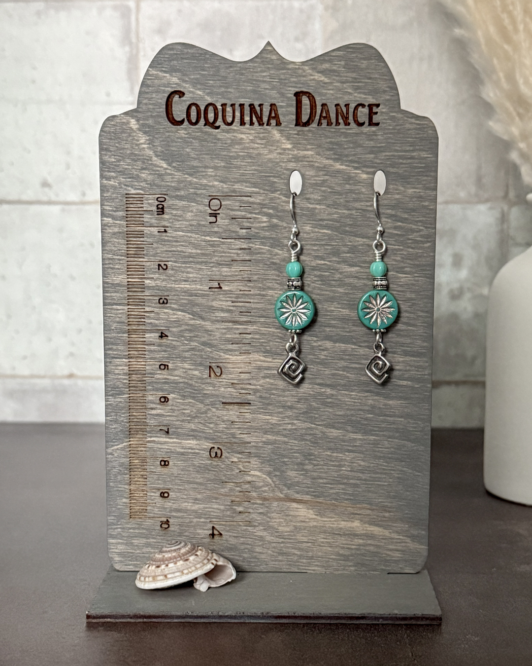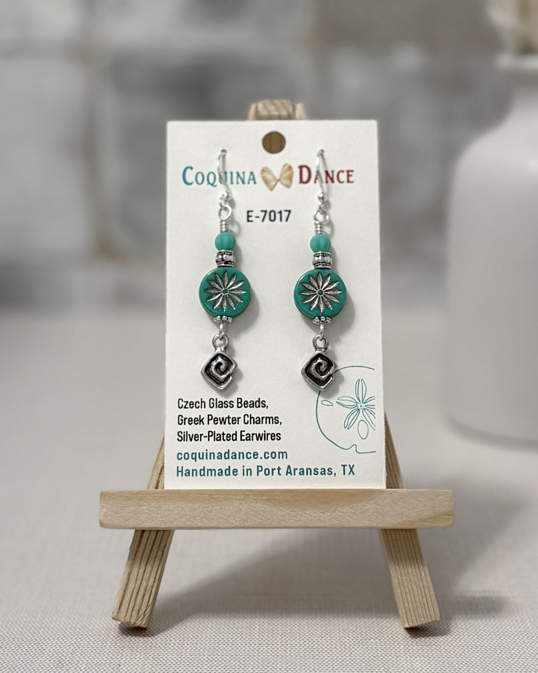 A meaningful, handcrafted pair for anyone who loves color, symbolism, and artisan-made details — these Turquoise Aster Czech Glass Coin Earrings blend expressive detail with a clean, minimalist silhouette — the kind of pair you reach for when you want color, artistry, and ease in a lightweight design.